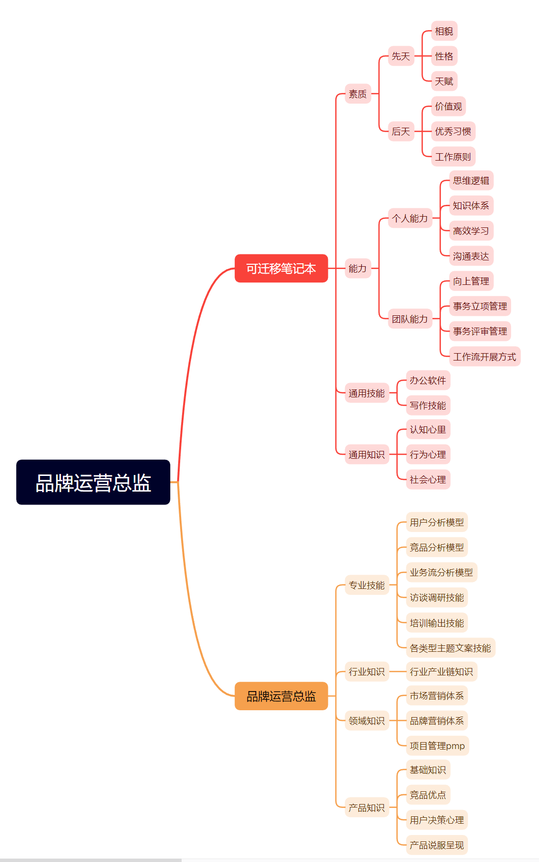 在我们工作坊里,我们以品牌运营岗位为例,建立符合岗位职责的知识体系,下面是品牌岗位的能力树,它是构建岗位知识体系的基础。